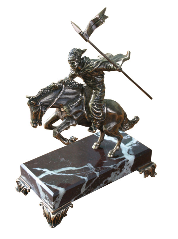 Статуетка з бронзи «Козак на коні» . На Вас чекають представляється дуже цікава статуетка «Козак на коні» . Статуетка була розроблена компанією Гарант і партнери, зроблена вона з бронзи і мармуру. Козак, що скаче на коні і з списом в руках, символізує борця за свободу, незалежність України і її народу. Такий подарунок допоможе одержувачу повірити в себе, свої сили. Подаруйте людям надію і віру в краще майбутнє.