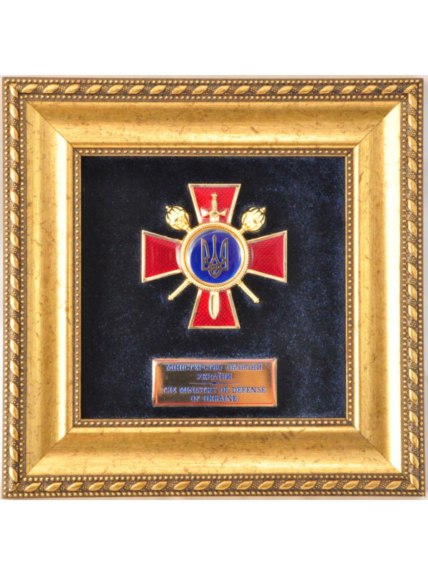 Використовуватися як відзнака честі та відданості працівникам Міністерства Оборони. Кріпиться на синій оксамит, який додає виробу вишуканості і облагороджує його. Сувенір ідеально впишеться в будь-який інтер'єр. Знак в рамі "Міністерство Оборони України" – це вишуканий та символічний елемент, який відображає важливість та високий статус Міністерства Оборони в країні.